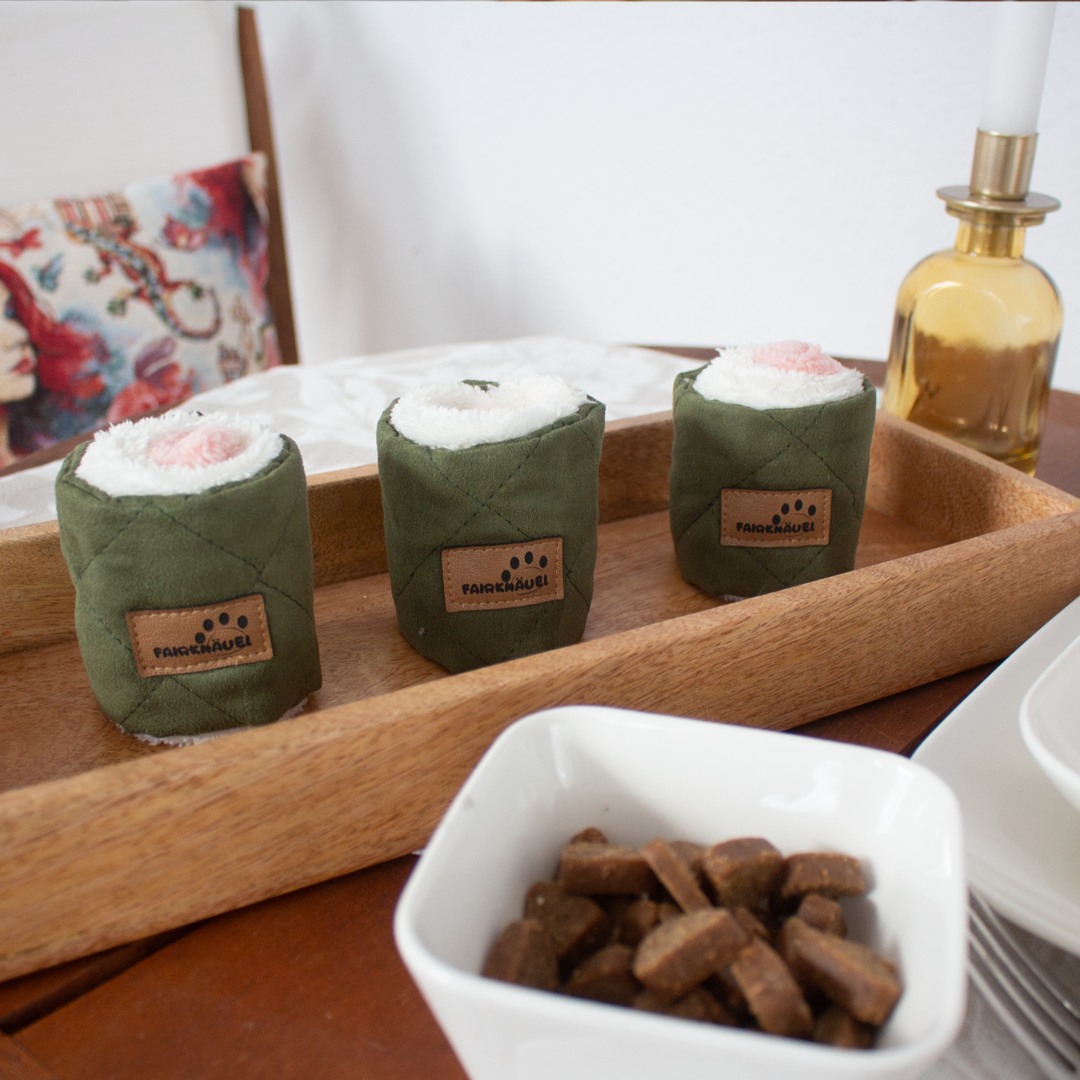 Ein köstliches Spiel für die Nase! Unser Schnüffelspielzeug in Form einer Sushi-Rolle bietet deinem Hund stundenlangen Spaß und fördert gleichzeitig seinen Geruchssinn. Gefertigt aus weichem Polyester und Baumwolle, kannst du in dieses Spielzeug mehrere Leckerlis einrollen, sodass dein Hund spielerisch danach suchen und sie auswickeln kann. Und das Beste: Es ist waschbar!